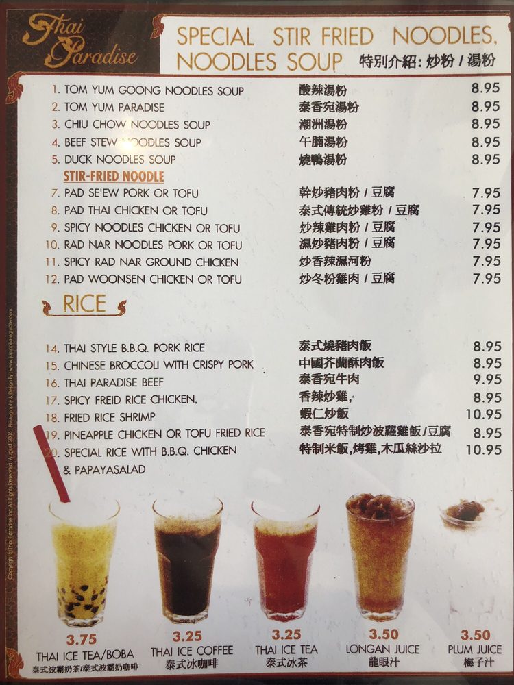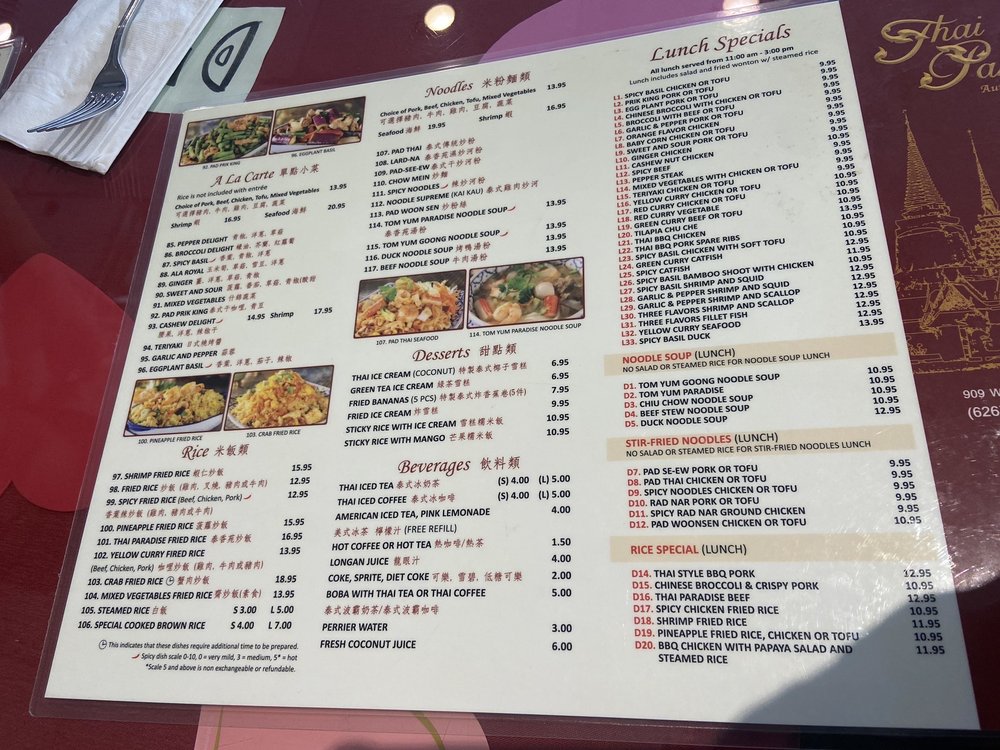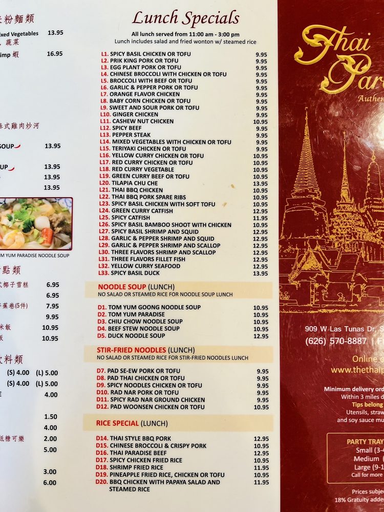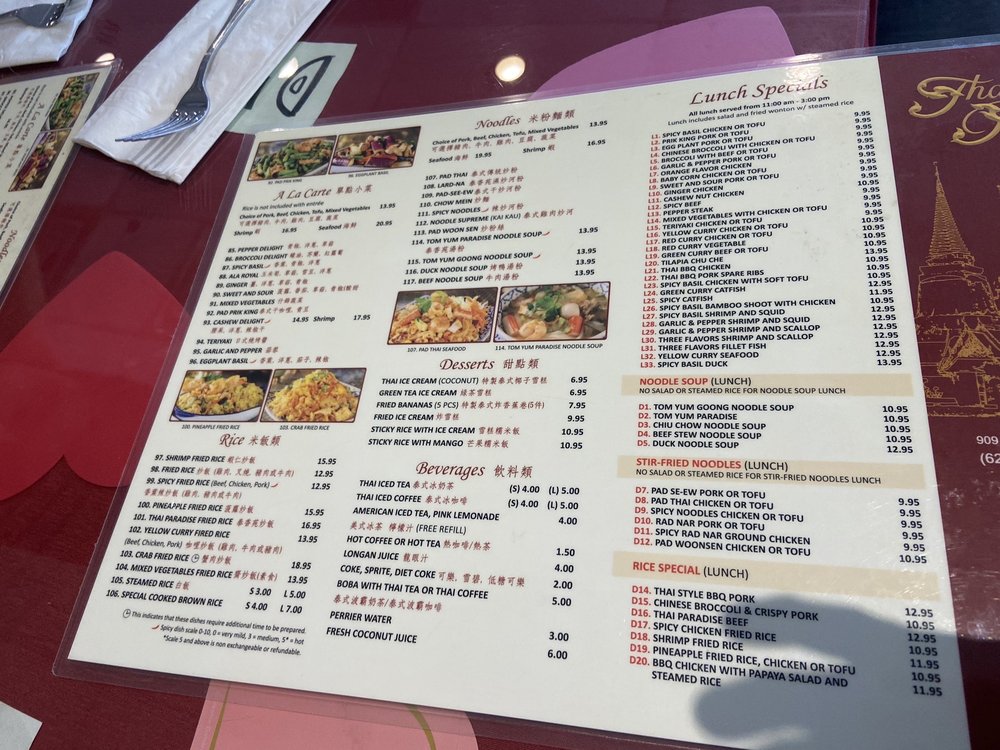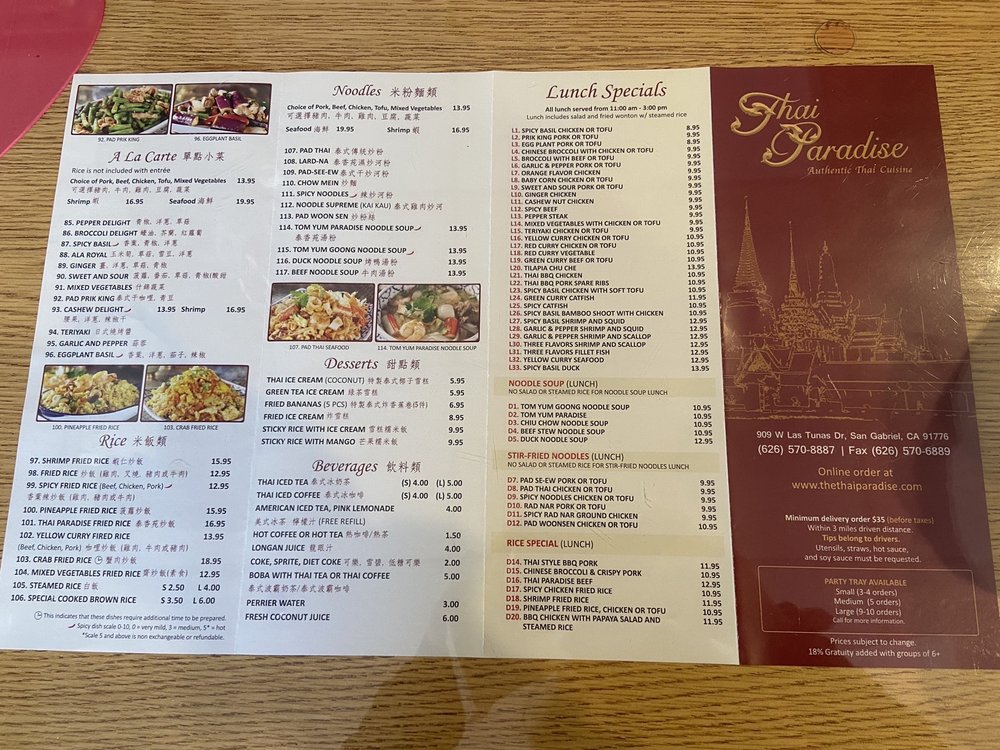 Introducing Thai Paradise San Gabriel, a beloved Thai restaurant in San Gabriel known for its authentic flavors and friendly service. The menu boasts a variety of classic Thai dishes, including noodles, curry, fried rice, and soups. Customers rave about the flavorful chow mein, coconut-based chicken soup, and crab fried rice. The restaurant offers many vegetarian options and caters to large groups, making it a great choice for a family outing or gathering with friends. With easy parking, attentive staff, and quick service, Thai Paradise San Gabriel provides a true taste of Thailand in a casual setting. Don't miss out on the delightful purple rice dessert and crunchy pebble ice for a sweet ending to your meal. Visit this Asian-owned gem for a satisfying dining experience that will have you coming back for more.