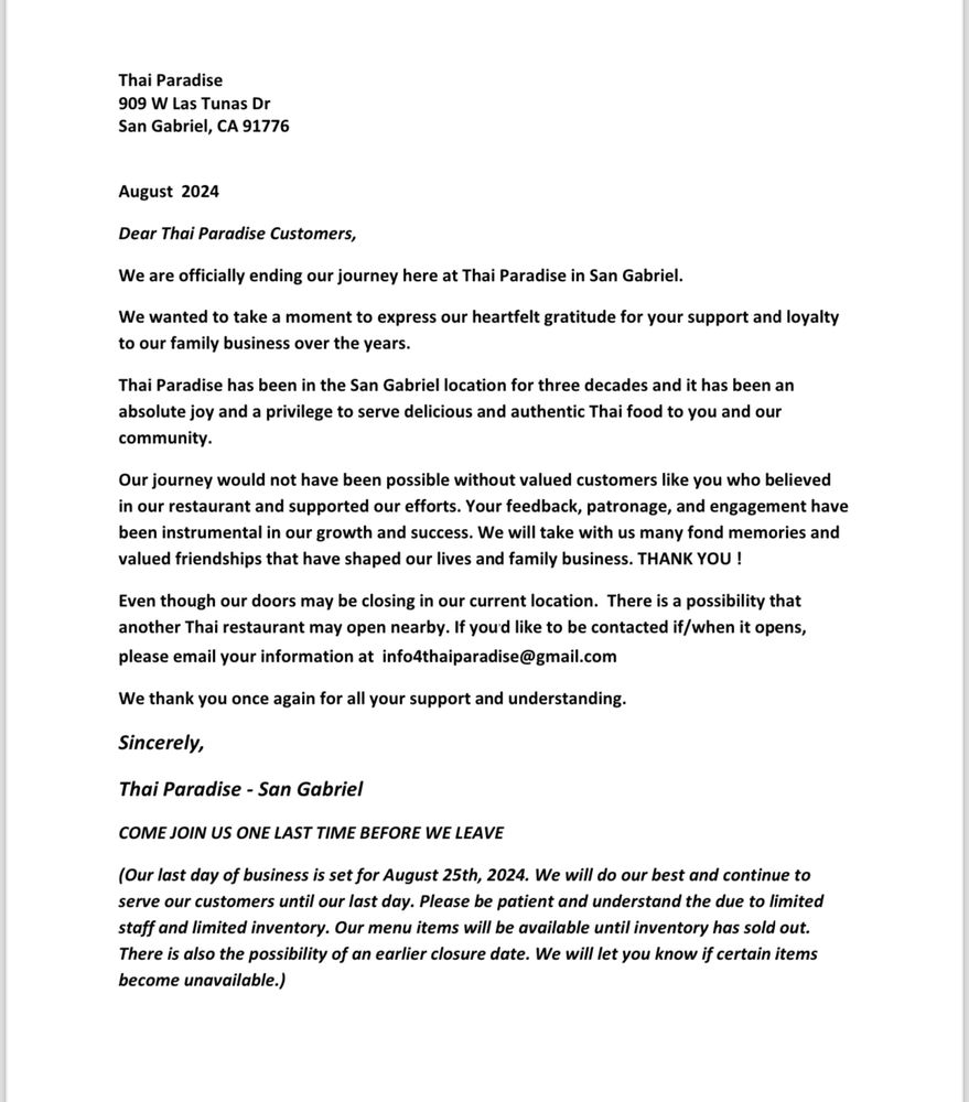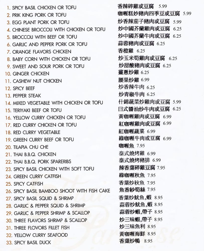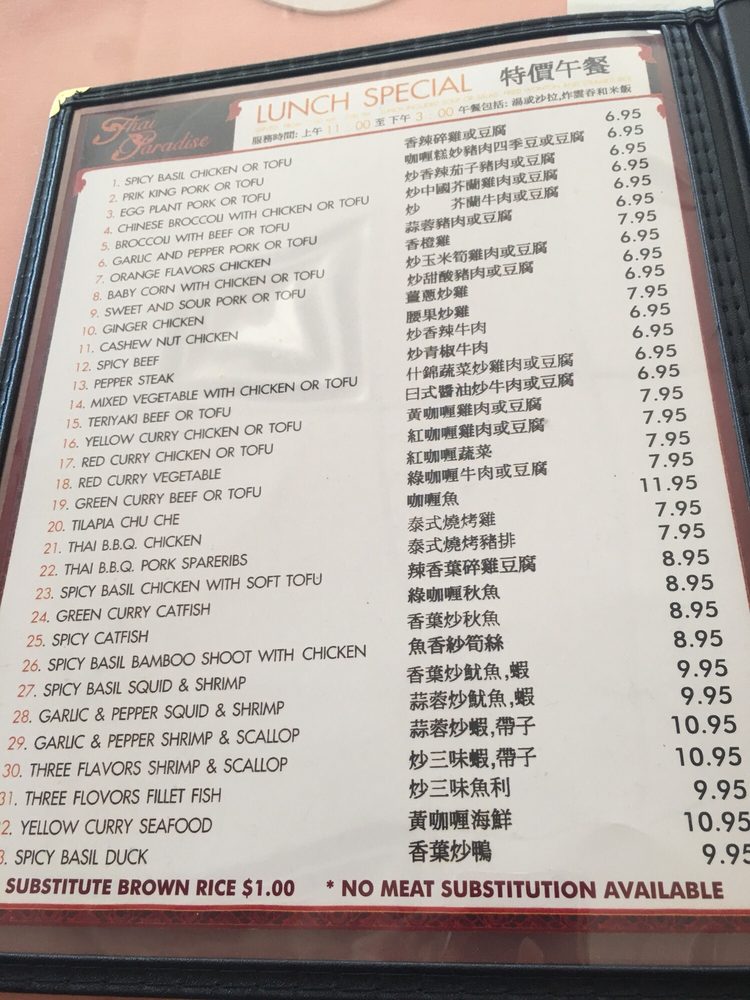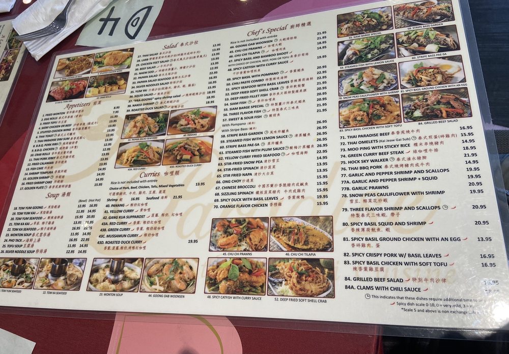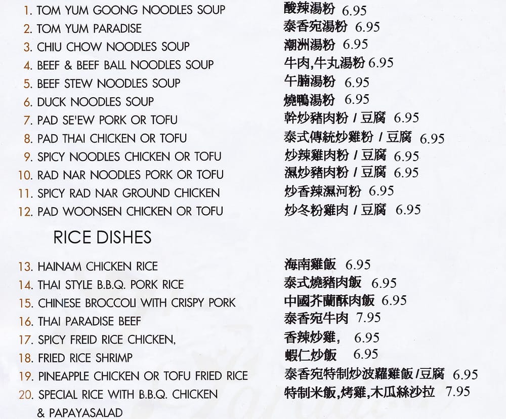 Introducing Thai Paradise San Gabriel, a beloved Thai restaurant in San Gabriel known for its authentic flavors and friendly service. The menu boasts a variety of classic Thai dishes, including noodles, curry, fried rice, and soups. Customers rave about the flavorful chow mein, coconut-based chicken soup, and crab fried rice. The restaurant offers many vegetarian options and caters to large groups, making it a great choice for a family outing or gathering with friends. With easy parking, attentive staff, and quick service, Thai Paradise San Gabriel provides a true taste of Thailand in a casual setting. Don't miss out on the delightful purple rice dessert and crunchy pebble ice for a sweet ending to your meal. Visit this Asian-owned gem for a satisfying dining experience that will have you coming back for more.